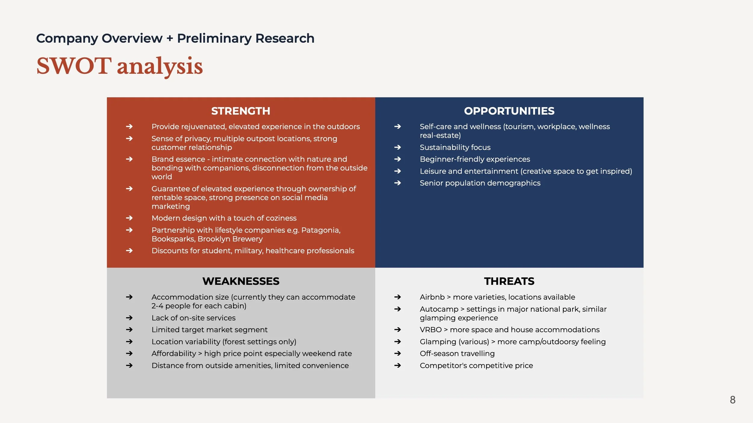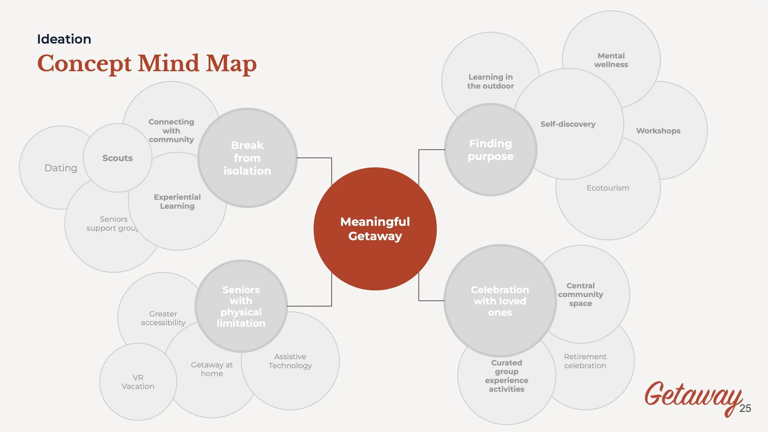 We identified newly retired seniors as our key target group based on their high level of independence, interest in travel, and availability on weekdays and between seasonal fluctuations. Providing this new experience would allow Getaway to occupy a new niche and gain a stronger market share over its competitors. However, we concluded that this market was high risk, high return; many considerations outside of the current Getaway experience would have to be taken to fully accommodate a new market.