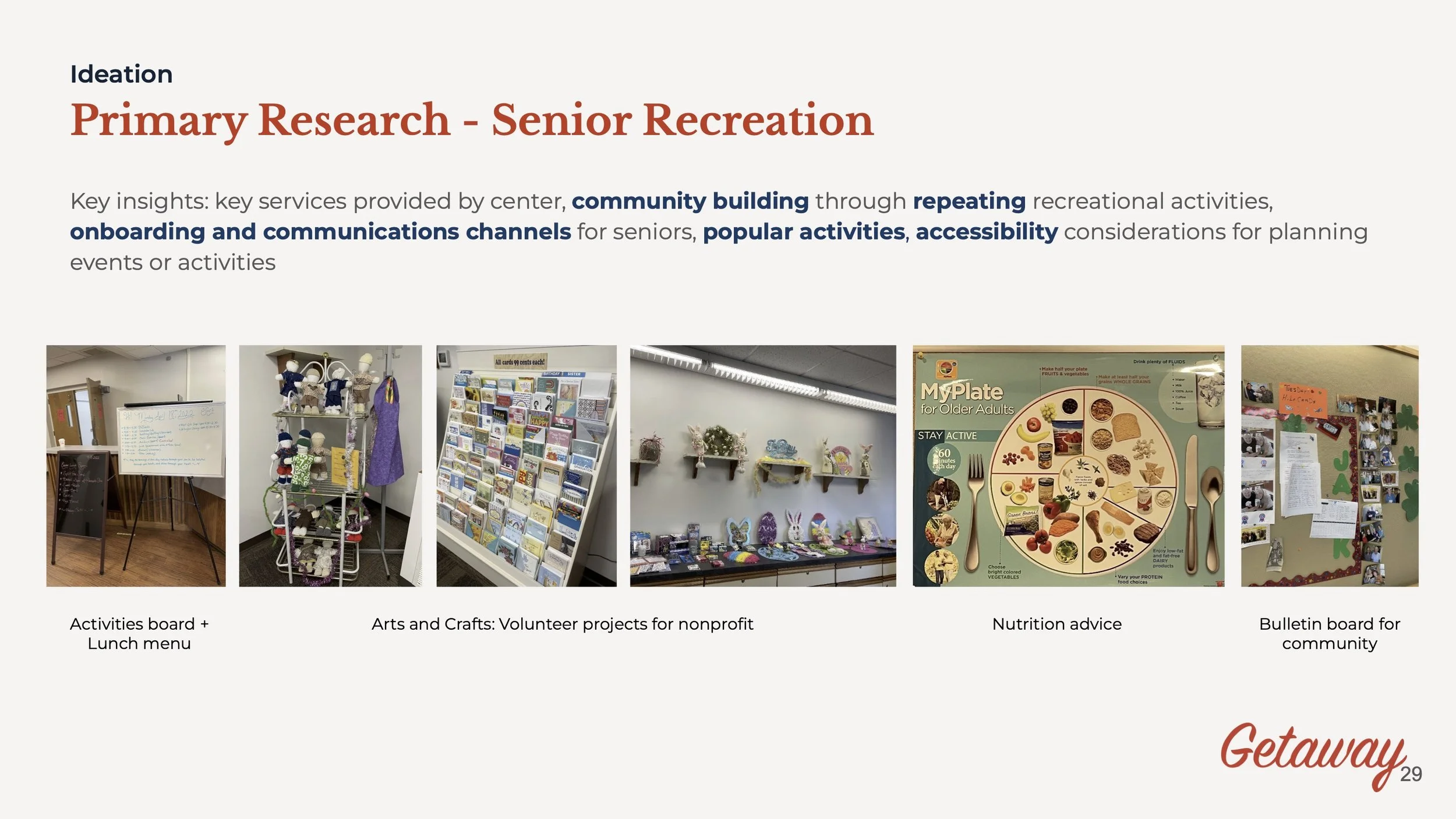 We conducted interviews with newly retired seniors and a director of a senior recreation center to gain insights on the senior experience, in aspects of: retirement, social life, travel, learning, as well as get feedback on the current Getaway experience and our proposed opportunity.