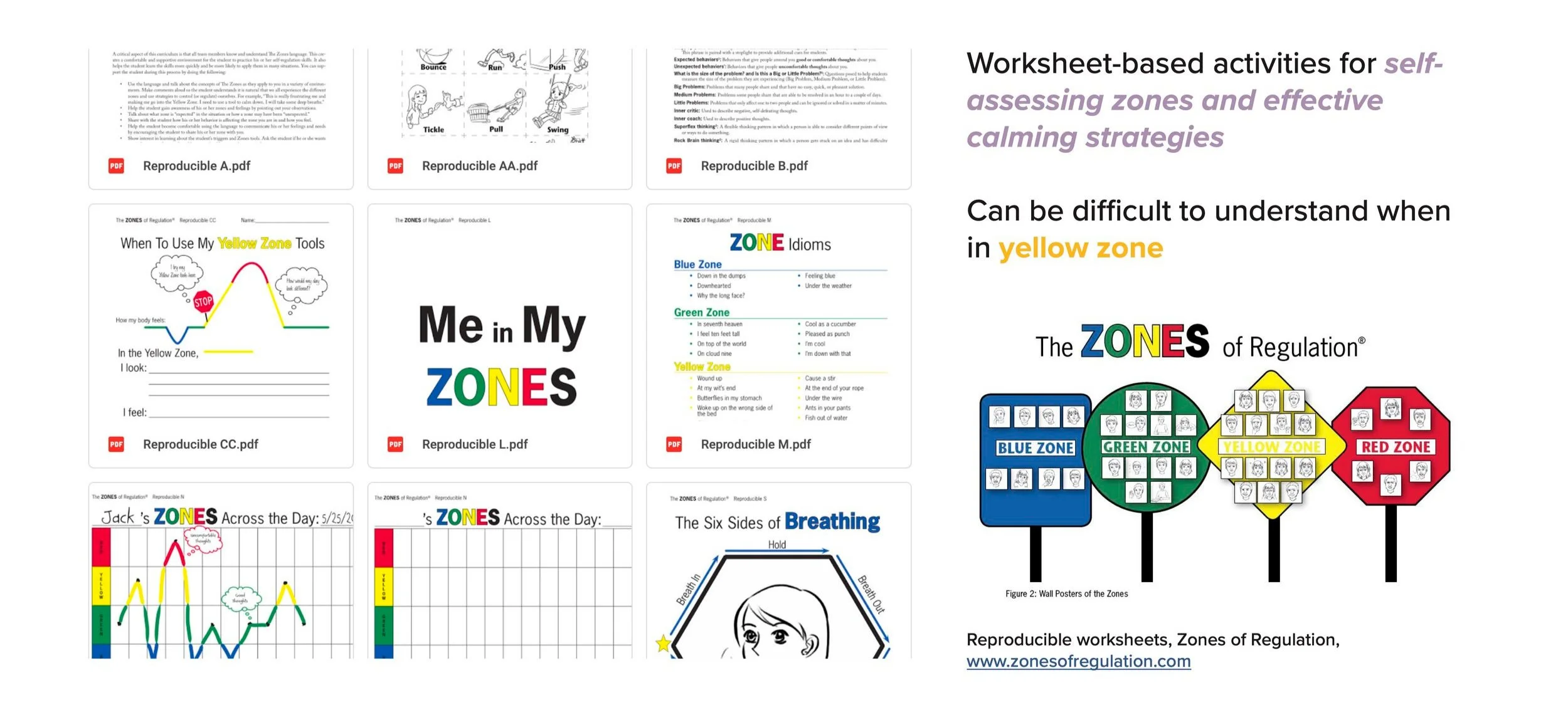 One main difficulty was in identifying and differentiating zones for young children. Resources were too removed from their experience to communicate differences in zones except at extremes. In particular, the yellow zone was described as the most difficult to recognize compared to the other zones, but also as the most critical for self-awareness and the introduction of de-escalation strategies. Once in the red zone, kids might feel the most "out-of-control" with their emotions and unable to de-escalate.